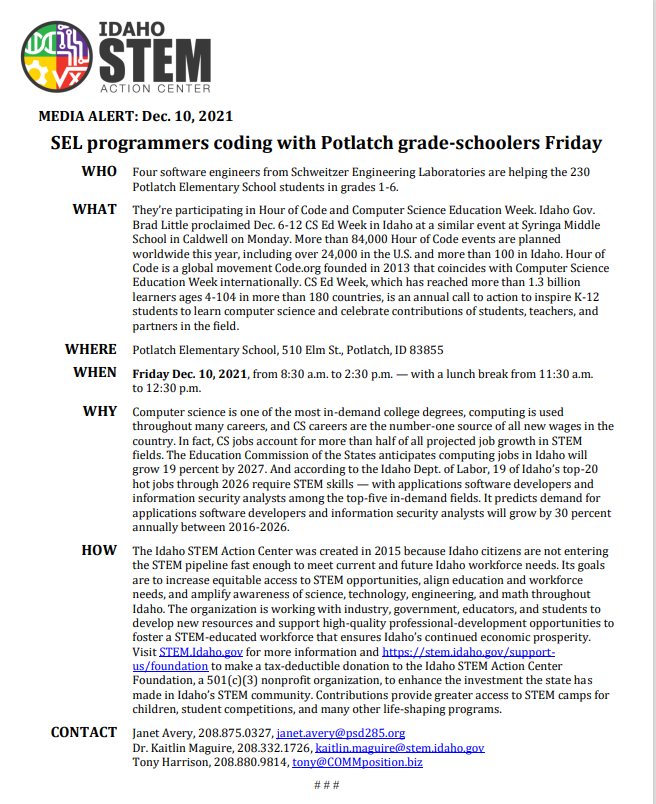 STEM in rural Idaho December 9, 2021December 9, 2021 / Jean hourofcode2021_mediaalert_potlatch_finalDownload Share this: Click to share on X (Opens in new window) X Click to share on Facebook (Opens in new window) Facebook Click to email a link to a friend (Opens in new window) Email Click to share on Pinterest (Opens in new window) Pinterest Like Loading... Related