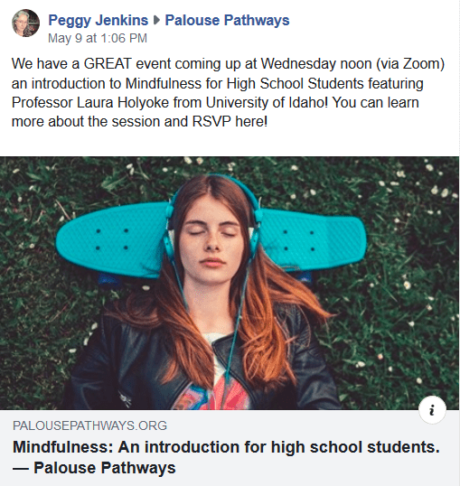 We have a GREAT event coming up at Wednesday noon (via Zoom) an introduction to Mindfulness for High School Students featuring Professor Laura Holyoke from the University of Idaho! You can learn more about the session and RSVP here!